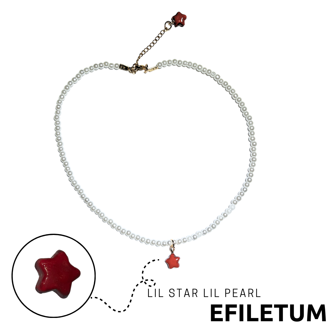 Naszyjnik Lil Star Lil Pearl – małe szklane perły (4 mm) i czerwona gwiazdka tworzą elegancką kompozycję. Wykonany ręcznie, z trwałej stali nierdzewnej. Regulowana długość (40–45 cm) sprawia, że to idealny dodatek do codziennych i eleganckich stylizacji.