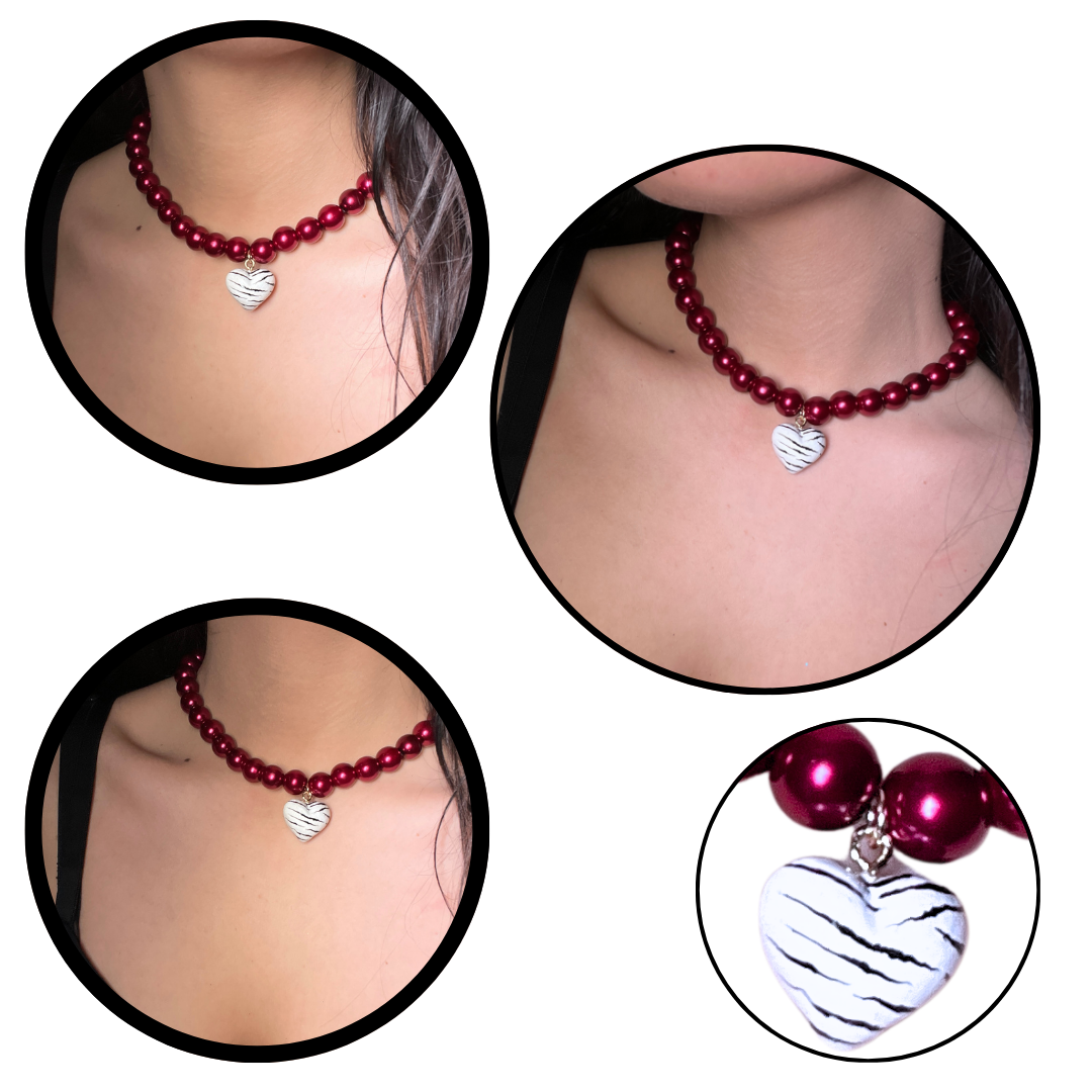 NASZYJNIK Z DUŻYCH BURGUNDOWYCH PEREŁ Z DUŻYM SERCEM ZEBRA