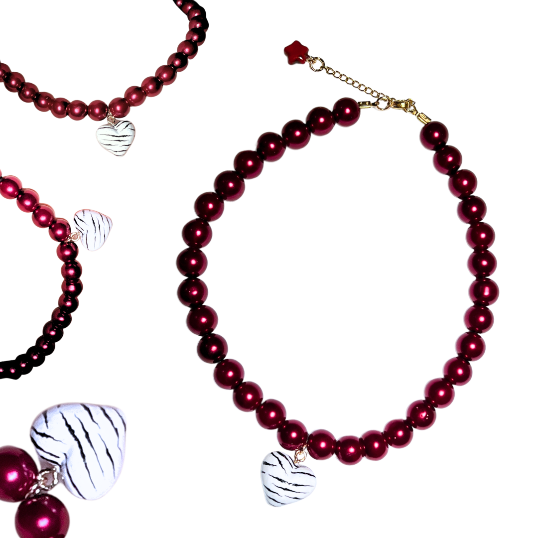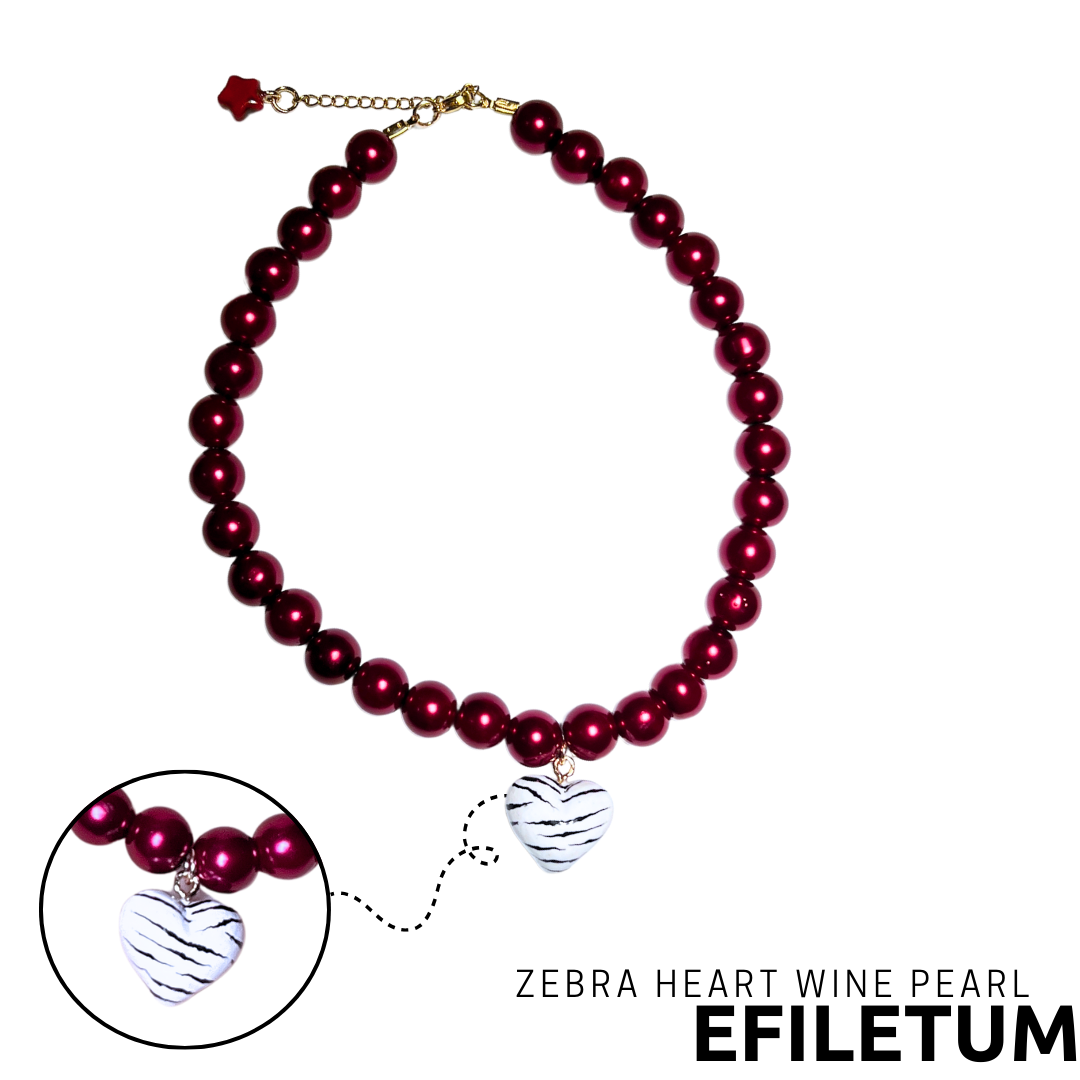 Naszyjnik Zebra Heart WINE Pearl – głębokie, winne perły (12 mm), duża zawieszka w kształcie serca z motywem zebry, czerwona gwiazdka. Elegancja i unikalność!