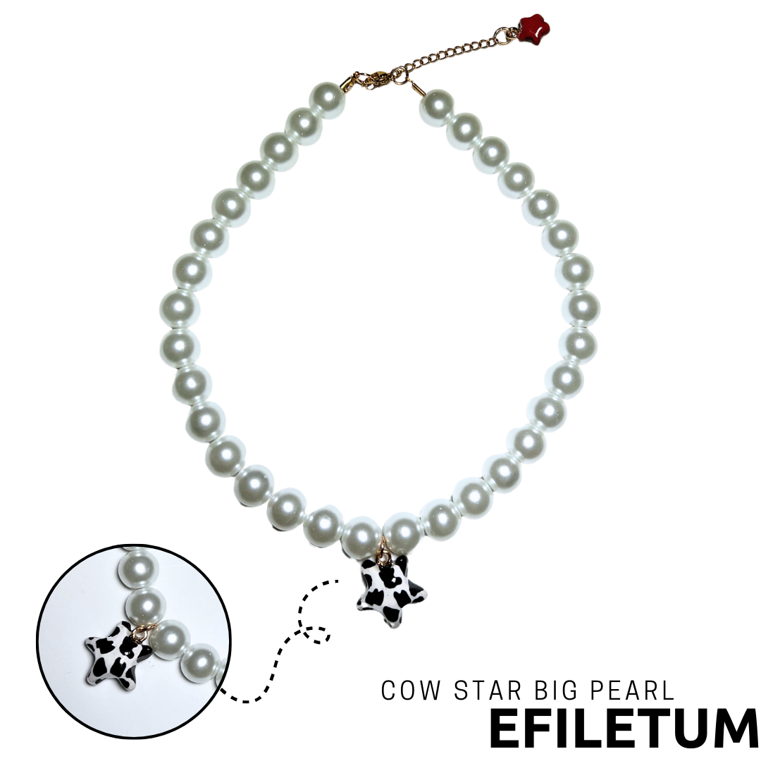 Naszyjnik Cow Star Big Pearl to oryginalne połączenie szklanych pereł (12 mm), zawieszki w kształcie gwiazdki z krowim wzorem i czerwonej gwiazdki. Biżuteria wykonana ręcznie z wysokiej jakości stali nierdzewnej, łączy klasyczną elegancję z nutą niebanalności.