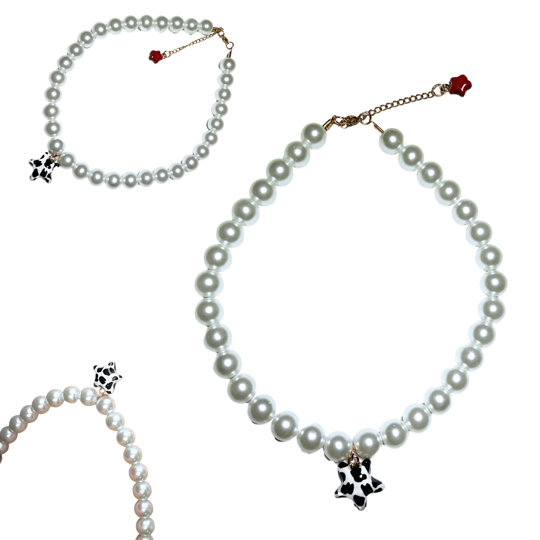 Naszyjnik, który skradnie Twoje serce! Klasyczne perły w towarzystwie zawieszki w krowie łatki – coś dla tych, którzy kochają połączenie elegancji z oryginalnym stylem. To dodatek, który doda Twoim stylizacjom wyjątkowego charakteru i nuty kosmicznej energii.